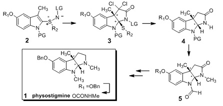 The protected indolylsulfilimine 2, made by functionalization of an appropriately protected indole with a chiral sulfilimine, reacts with dichloroketene to give dichlorolactam 3 in 70% yield. Removal of the chloro, thioether, and leaving group is accomplished in a single step (nBu3SnH, AIBN) to afford the lactam 4. Exchange of the indole protecting group with an N-formyl, followed by lactam N-methylation, gives key intermediate 5, which previously was transformed into the natural physostigmine (1).