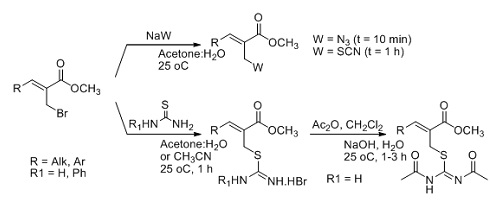 Tuberculosis (TB) is caused by the bacterium Mycobacterium tuberculosis (Mtb). This dreadful disease has been responsible for the deaths of over one billion people and currently infects one-third of the world's population. Our laboratory, in collaboration with Prof. Sá research group which has had a long research interest in the Morita-Baylis-Hillman (MBH) reaction, preparared of various allylic azides, thiocyanates, isothiouronium salts, and N,N'-diacetylisothioureas in aqueous medium as versatile scaffolds for synthesis (Scheme 3). Thus, five new and promising compounds having good (micromolar) to excellent (sub-micromolar) potency against replicating Mtb H37Rv were identified.2