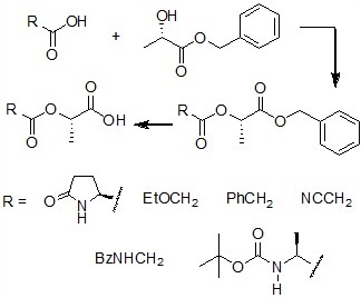 In this way, representative models for depsipeptides were readily obtained by a two-step procedure using mild conditions and easily accessible reagents: esterification of inexpensive (S)-lactic acid, couple of the resulting ester with the proper a-functionalized acid, and deprotection (scheme 4).